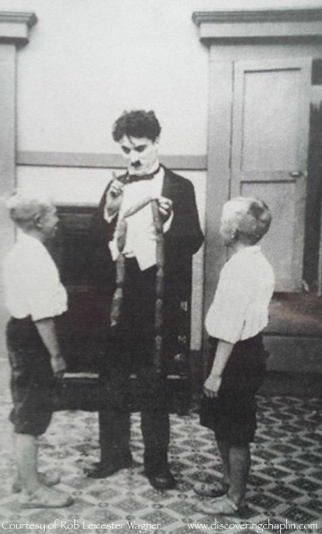 On the set of The Adventurer (1917). At far right is Syd Chaplin. Next to him is Rob Wagner. In front of Charlie, in white, are Wagner's sons Leicester (left) and Thornton (they are not twins). Please comment if any of you can ID the other people. |