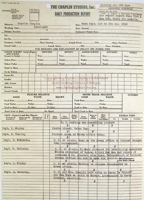 This production report shows that the Chaplin Studio was closed on Labor Day, September 1st, 1952. It also records Chaplin's final days in Hollywood--Sept. 5th being the last day he ever set foot in the studio he built in 1918. The next day, he left California for London for the premiere of Limelight, not to return until 1972.